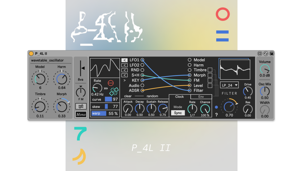 - a virtual Plaits oscillator, complete with internal envelope / LPG, designated Level control, and dual outputs, with all parameters exposed for modulation either internally, via Live, or both.