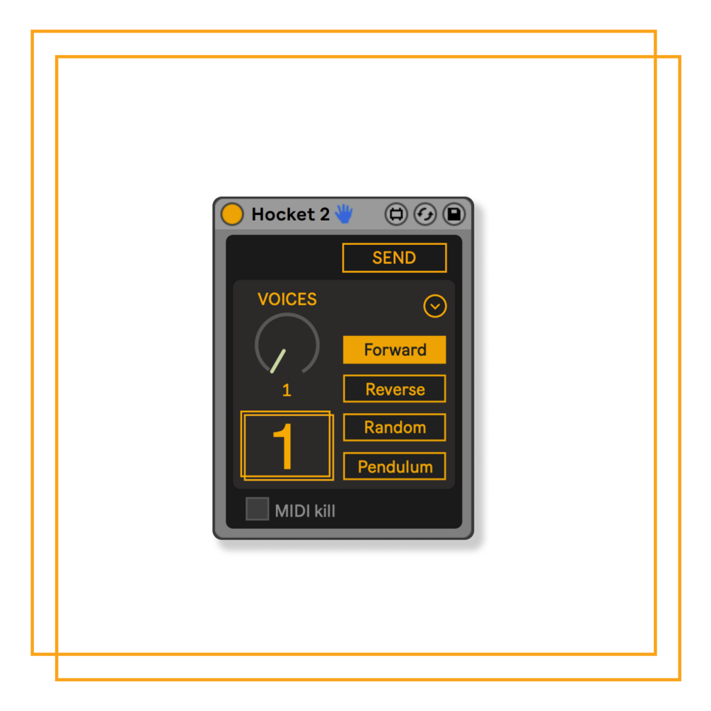 Hocket II takes the MIDI note messages on a track and splits them up into single-note events which are routed to up to eight other channels. Additional Hocket devices on those channels pick up the notes and play them. This allows for one piece of melodic content to be split up among multiple instruments, achieving a Hocketing effect.